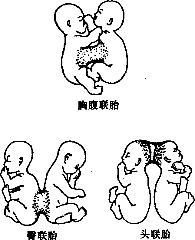 ❸第一次卵裂时分离为二,它们各自发育为一个胚胎。但人的受精卵围有透明带,卵裂时分离的可能性较小。在单卵双胎中。当一个胚盘出现两个神经管并分别发育为两个胚胎时,若胚胎分离不完全,两个胚胎发生局部联接,称为联体胎(见图2.4-5)。根据联体胎联接部位的不同分为头联胎、臀联胎和胸腹联胎等。一次娩出两个以上新生儿为多胎。多胎的原因可以是单卵性、多卵性或混合性。常为混合性多胎。多胎发生率低,如三胎约万分之一,四胎约百万分之一,四胎以上的更为罕见,多不易存活。