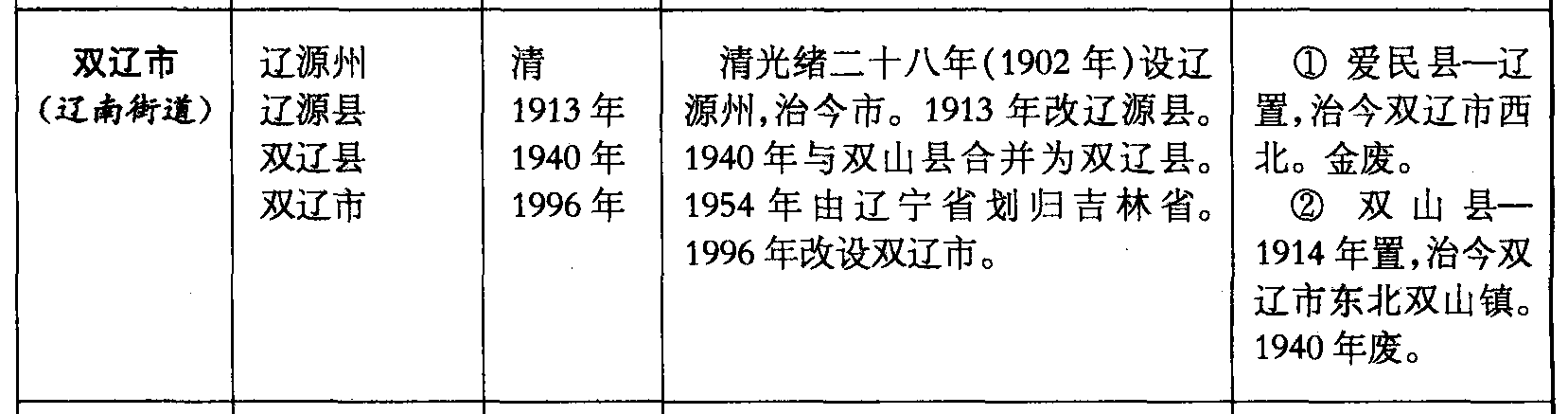 双辽市(辽南街道)辽源州辽源县双辽县双辽市清1913年1940年1996年清光绪二十八年(1902年)设辽源州,治今市。1913年改辽源县。1940年与双山县合并为双辽县。1954年由辽宁省划归吉林省。1996年改设双辽市。❶ 爱民县—辽置,治今双辽市西北。金废。❷ 双山县—1914年置,治今双辽市东北双山镇。1940年废。