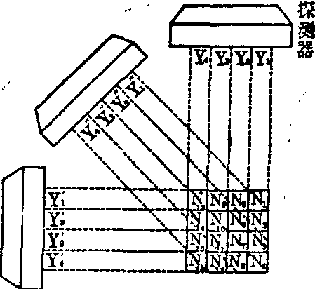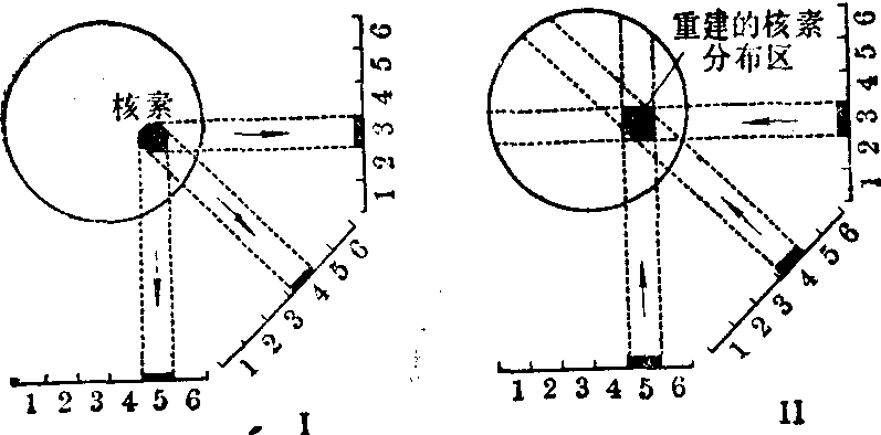 但是,如果从不同方向对同一断层摄象,则核素在每一摄象上的“投影”部位不同。把这些投影综合起来分析,就可判断出核素在该断层中的确切部位(图2)。图中重建的核素分布图虽与核素的真实分布部位相符,但影象形状有差异。这是因为只用了三个方位的“投影”。实际工作常需摄取数十甚至上百个“投影”,才能得到良好的重建图。 图3 进一步从数学角度分析断层核素分布图的重建原