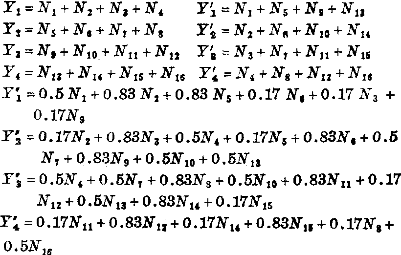 图3 重建断层核素分布图的数学分析 理。首先把断层面分为若干单元,称为象素单元,它们所含放射性活度分别用N1、N2、N3……代表。于是每次“投影”所得各点的cpm实际上是相应的若干个N在“投影”上形成的cpm之和。假如每个象素单元在各“投影”面上的计数效率全都相等(以E代表),则每次“投影”可得一组方程。以图3为例应为: