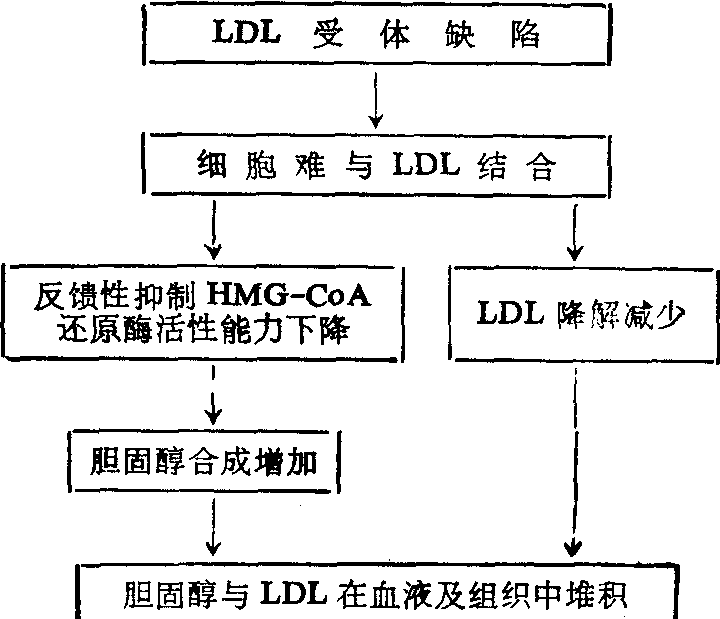 原发性高脂蛋白血症从生物化学上可分为五型,其中Ⅱ型在中国约占40%,且与动脉粥样硬化的关系非常密切。Ⅱ型高脂蛋白血症的发病原因是低密度脂蛋白(LDL)受体缺乏或减少,这样一方面LDL难以进入细胞,于是LDL降解减少,血浆LDL升高;另一方面由于LDL进入细胞受阻,细胞缺乏游离胆固醇以抑制β-羟-β-甲基戊二酸单酰辅酶A (HMG-CoA)还原酶,从而不能反馈性抑制内源性胆固醇的合成。细胞合成胆固醇的速度增加,将使血浆LDL进一步升高。