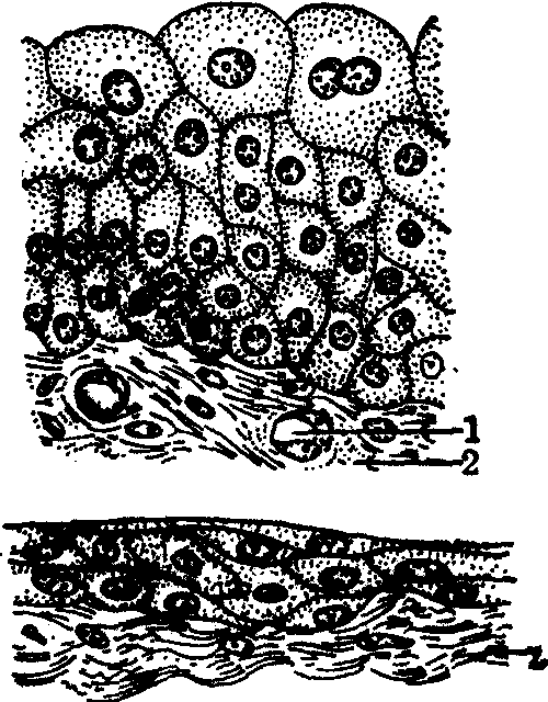 变移上皮模式图 上图示收缩状态的上皮,下图示扩张状态的上皮 1.毛细血管 2.结缔组织 传统上将此种上皮列为复层上皮。但近年有些研究表明,表层和中间层的细胞的突起都附着于基膜,故有人将它列为假复层上皮。电镜下见到,盖细胞的浅层细胞质含许多细丝和囊泡;基底层细胞内有质膜内褶和囊泡。器官扩张时,随着细胞形状和排列的变化,细胞内的囊泡和质膜内褶变小或消失。质膜内褶和囊泡可能是器官收缩时上皮细胞保存多余细胞膜的一种方式。细丝可能防止细胞过分变形,以免细胞破坏。 ☚ 复层柱状上皮 微绒毛 ☛ |