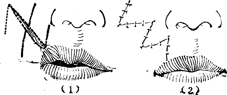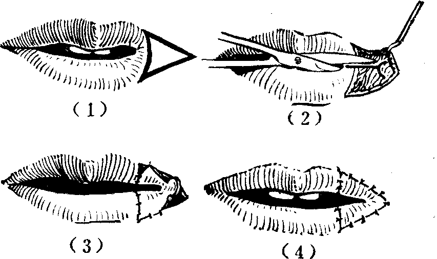 图4 颊部粘膜瓣移转矫治小口畸形 唇外翻 局限性外伤瘢痕愈合后所形成的局部口唇轻度外翻,比较少见,一般只表现为红唇缘的局部凸出不齐,口裂不能紧闭,外翻部呈切迹状缺裂。这种外翻可酌情采用单一或连串Z成形术(图5),或V-Y手术(图6)矫正修复。