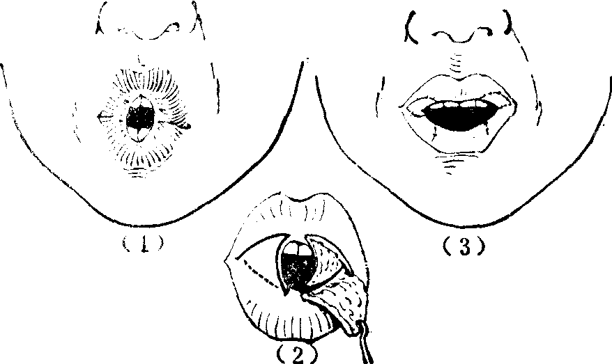 图1 口角歪斜Z成形术矫治 小口畸形 口角部瘢痕挛缩引起变形所致。多继发于口周皮肤烧伤,或口唇粘膜较重的感染,或化学性损伤。近年来在家用电器比较普及的地区或国家,幼儿玩弄吸吮电器插头,发生口周皮肤粘膜电烧伤,瘢痕挛缩形成小口畸形,已成为一种典型病症。口角挛缩,可局限于一侧,但以双侧为多见。表现为口裂缩小,重者状似鱼口,进食和语言功能都有严重障碍。由于被迫经常用力张口,常引起局部脆弱瘢痕组织的反复皲裂或形成溃疡。小口畸形可采用口角皮肤瘢痕切除,粘膜Y形切开法治疗(图2)。有些小口畸形,是由口角前方的蹼状瘢痕封闭所致,口角被掩盖在蹼的深面,仍保持完好。这种小口畸形可按Z成形术原则修复(图3)。口角部因电烧伤,粘膜受损瘢痕深厚者,则须于切除瘢痕后采用上下方颊粘膜瓣移转以修复口角部的红唇(图4)。