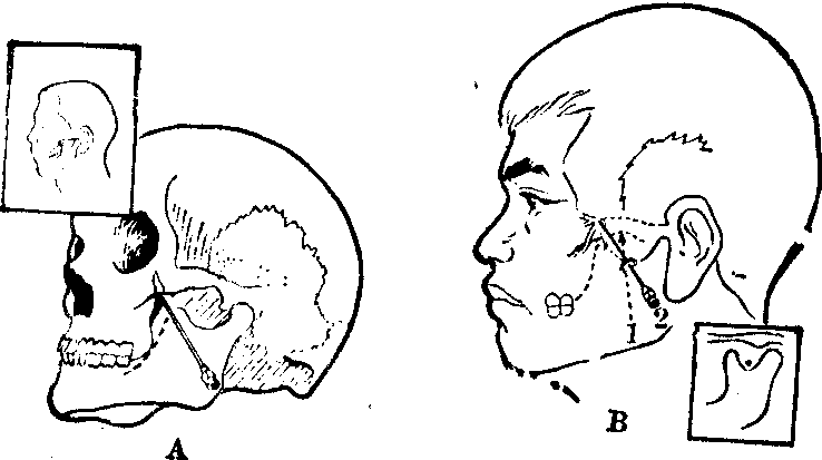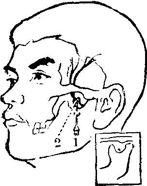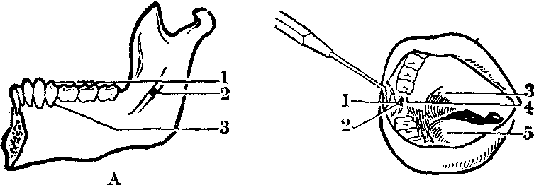 (7) 下牙槽神经阻滞麻醉: 是临床上常用的方法,分为口内、口外两种注射法,前者应用最广。 ❶口内法:当病人大张口时,口腔两侧磨牙后与咽部之间,各有一垂直向的粘膜皱襞,称为翼下颌皱襞,此即下牙槽神经阻滞麻醉的重要解剖标志。以颊脂垫尖部,即翼下颌皱襞中点外侧3~4mm处作为注射刺入点,此点恰在下颌磨牙颌面之上1cm假想平面的粘膜上,由此进针可越过下颌小舌的阻挡。若遇到颊脂垫尖不明显或上、下颌磨牙缺失的病人,可以在大张口时上、下颌牙槽嵴之间的中点与翼下颌皱襞中点外侧3~4mm的交点, 作为注射标志。 病人大张口时,下颌牙颌面应与地平面平行。将注射器摆在对侧下颌双尖牙区,与中线约成45°角,注射针应高于下牙颌面1cm并与其平行。按照上述的注射刺入点进针,一般深约2.5cm左右即达下颌支内侧,可触及下牙槽神经沟骨面。回抽无血,即可注射药液1.5~2ml。注射后5分钟左右显效,麻醉同侧下颌骨、下颌牙、牙周膜、双尖牙至中切牙唇(颊)侧牙龈、粘骨膜、下唇及颏部。 ❷口外法: 张口受限的病人或口内进针区有化脓性炎症及肿瘤时可采用口外注射法。自耳屏前至嚼肌前缘与下颌骨下缘相交之点作联线,联线的中点即大致相当于下牙槽神经孔上方的下牙槽神经沟部分,此点即为注射时针尖应到达的部位,称为注射点。自下颌角至嚼肌前缘之中点定为刺入点。在刺入点至注射点之间的联线,即表示针刺入后走行路线及深度。注射针从刺入点刺入,紧贴下颌支内侧面,进针至上述深度。回抽无血即注射药液2~3ml。麻醉区域及效果同口内法。(图3)