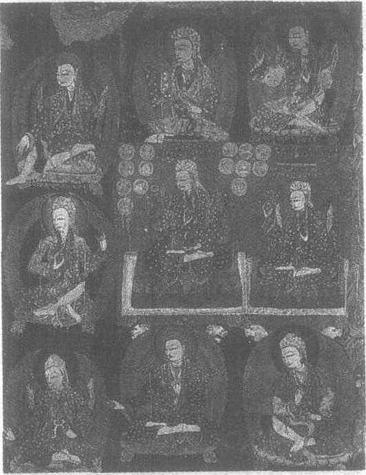 古格(公元10世纪至17世纪)。纵104厘米,横82厘米。西藏自治区札达县古格王国都城遗址白庙北壁壁画。公元10世纪上半叶吐蕃王朗达玛的曾孙德朱贡在札达县札布让、托林一带建立古格王国,历经700年。古格王国都城废弃于17世纪上半叶。遗址中有保存较为完好的寺庙,壁画分布其中。据专家考证,白庙北壁的壁画是第六位古格王当朝时绘制的,当时中原正处北宋中期。古格王统世系图为北壁壁画中的一部分,图中表现了九位古格王,从上至下分列为三排,第一排的三位均有藏文题名,从左至右依次为第一代王的一位兄弟,第四代王和第五代王。人物的形象差异不大,头均略偏向左侧,细长腿,高鼻,表情基本相同。多数结跏趺坐,有的为游戏坐,手姿则无雷同,九位九式。服饰的差异也不大,头裹巾,穿彩色长袍,脚蹬高筒靴。中间一排有两位,身后无背光,座位上有垫,头顶有华盖,座垫及华盖均极富丽,据推测是当朝王及王子。壁画采用单线平涂,金色皮肤,服饰、背光及座位等均涂以艳丽色彩。此图对研究古格历史具有重要的参考价值。