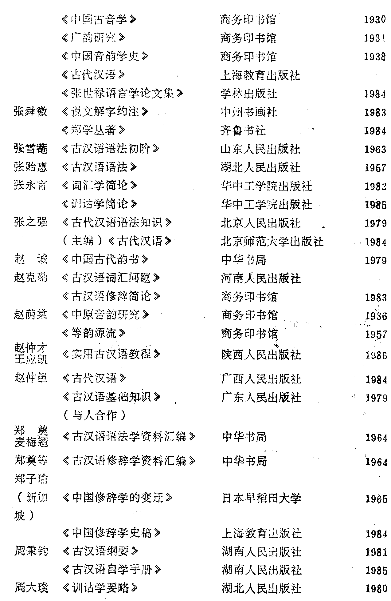 说明 1.本表收录范围,以1949年以后我国学者编撰的关于古代汉语研究方面的专著为主,由于时间、资料的限制,遗漏在所难免。 2.台湾、香港的古汉语专家、专著,因无法全面了解,故仅能就现有资料作举例性的介绍,附于表后。 3.为避免重复,对本辞典中已列入正文条目的古汉语专著及工具书,表中从略。 4.本表的编排方法,是先列个人编撰的著作,次列集体编写的著作,依作者姓氏(编写单位)的现代汉语拼音字母顺序排列。 |