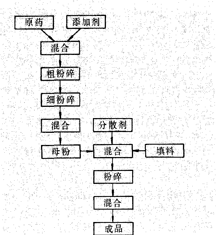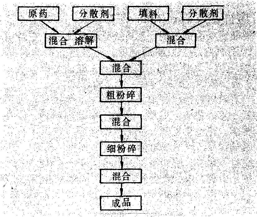 定量经过精选的添加剂和填料混合,经粗粉碎、细粉碎后,成为母粉(粒径5微米左右),再与分散剂及初步粉碎的填料混合,再经过粉碎、混合而成。加工流程如图2。 质量指标 可湿性粉剂的质量指标有: 有效成分含量、悬浮率、润湿性能、水分含量及酸碱度(pH值)。这些指标中较重要的除有效成分含量外,是悬浮率和润湿性能。悬浮率是制剂用水配成悬浮液后,经一定时间,其中有效成分在水中的悬浮百分率。悬浮的时间长,表明在喷洒过程中药液中的有效成分能