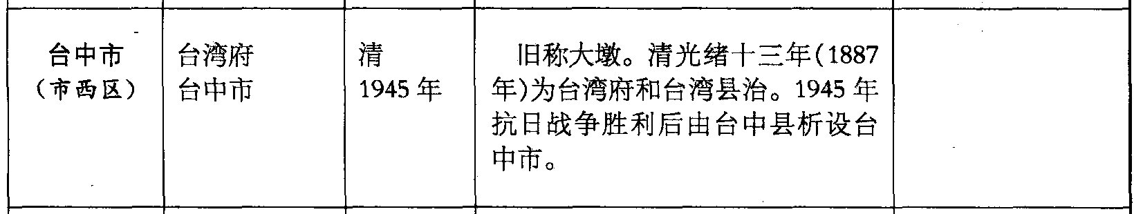 台中市(市西区)台湾府台中市清1945年旧称大墩。清光绪十三年(1887年)为台湾府和台湾县治。1945年抗日战争胜利后由台中县析设台中市。