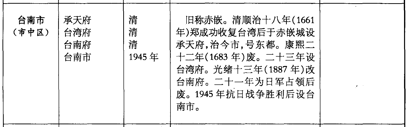 台南市(市中区)承天府台湾府台南府台南市清清清1945年旧称赤嵌。清顺治十八年(1661年)郑成功收复台湾后于赤嵌城设承天府,治今市,号东都。康熙二十二年(1683年)废。二十三年设台湾府。光绪十三年(1887年)改台南府。二十一年为日军占领后废。1945年抗日战争胜利后设台南市。