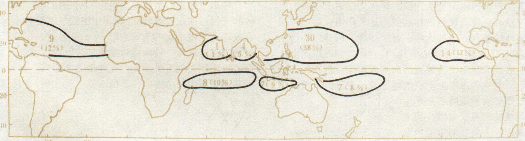 图1 各台风发生区发生台风的年平均数及其占全球台风总数的百分比 北太平洋西部各月发生台风次数和在中国登陆次数(1949~1969)