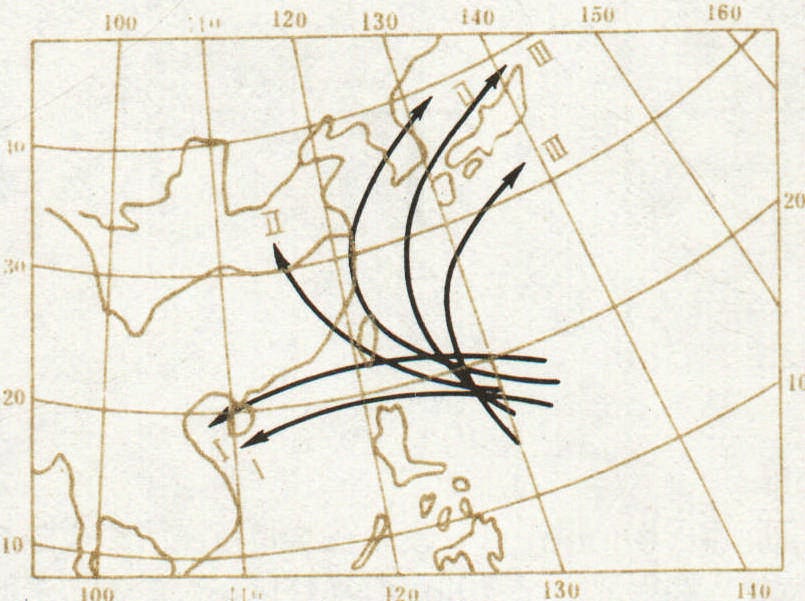 图2 1949~1969年达到台风强度的初始位置的频数 ![]() 图 3 台风垂直剖面流场示意图 形成、发展与消亡的条件 ❶台风是强烈涡旋运动的天气系统, 只有当原来更大范围流场是旋转的,经过辐合运动, 把旋转属性集中到较小的范围, 才能使旋转加强而发展为台风。有利于生成台风的更大的天气系统是热带辐合带(见辐合带)和东风波。 ❷随着地球旋转的大气, 也具有旋转属性, 在辐合运动的条件下, 也可因偏向力的作用, 转化为相对于地表的旋转运动, 致使台风生成和加强。这种作用在高纬较强而低纬较弱, 赤道处为零。低于纬度5°的地区不易生成台风。 ❸台风是个暖心系统,只有在广阔暖洋面上才易生成。实际形成台风时的海水表面温度都在27.5℃以上。在这种海洋上形成的暖湿空气上升, 水汽凝结释放潜热而形成暖心, 是生成和维持台风能量供应的主要来源。 ❹要在对流层内形成垂直的暖心, 在台风生成的初期, 台风中心上空的对流层内上下层风的差异不能太大,否则暖心就不易形成,或上下暖心呈倾斜状态, 也不利于台风发展。 ❺在对流层的上部和平流层下部要有辐散气流, 把从近地面层流入的空气质量和热量散到远处, 才能形成和维持台风暖心低压的结构。台风消亡的条件与生成时相反, 当台风移到冷洋面可减弱、消亡;台风登陆后因水汽供应锐减和地表摩擦骤增而减弱、消亡;台风移到西风带, 因冷空气进入而破坏暖心结构, 变成锋面气旋。 移动 北太平洋西部台风移动的基本路径, 可归纳为三类, 如图4所示, 路径Ⅰ, 台风由菲律宾以东一直向西行, 经南海, 在海南岛、广东、广西或越南登陆。对中国广东、广西天气影响较大。路径Ⅱ, 台风由菲律宾以东向西北方移动, 在中国台湾、福建、浙江、上海等地登陆, 登陆以后, 有的在内陆消亡, 有的再转向东北入东海或黄海, 变为锋面气旋。这类台风对中国天气的影响最大。路径Ⅲ呈抛物线状, 台风先向西北或北方移动, 后转向东北, 这类路径的台风为数最多。如在近海转向, 也可影响中国东部沿海地区的天气, 如在远海转向,则对中国天气的影响不大。台风移动速度平均约为每小时20~30公里。在停滞、打转时移速较慢, 转向后移速常加快。台风的移动受周围流场和天气系统及其内部作用力的影响, 有时台风移动呈现出复杂的路径, 图5是一些实例,有打转、摆动等异常情况。复杂的路径是台风预报的难点。