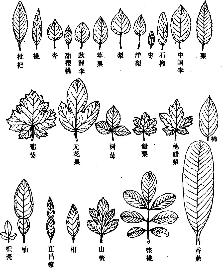 图 2 主要果树的叶 叶在枝条上的着生次序叫叶序, 果树叶序主要有互生、对生二种类型。在枝上每一节只生一叶的为互生叶序,互生叶序的叶在枝上呈螺旋排列,叶序有1/2、1/3、2/5、3/8、5/13等方式。多数果树互生叶序为2/5式, 即相邻两叶在茎周相距2/5周,即144°处着生。葡萄和部分栗叶则为1/2式,相邻两叶相距1/2周,即180°处着生。石榴、番石榴等是对生叶序, 枝上每一节有两叶相互对生,而且相邻两节的对生叶常成垂直方向,使叶片互不遮蔽。 叶的作用 叶的主要功能是进行光合作用。自展叶开始, 随叶片增大光合强度也逐步增强, 到叶片停止扩大成熟时达最强, 以后, 随叶片的衰老而逐渐下降。这种现象, 在常绿果树中表现尤为突出。对于大多数落叶果树, 在叶幕完全形成时为光合作用能力的最盛期。落叶果树叶的同化能力一般高于常绿果树,不同品种叶的同化能力也不尽相同。叶的同化能力与光照水平关系密切。树冠内膛光照差, 表现叶片小、薄而色浅,同化能力弱。此外, 温度、CO2浓度、水分、矿质元素和果园位置的海拔高度对叶片的光合作用也有明显影响。 叶还具有蒸腾、呼吸、气体交换、呼吸等多种生理功能, 利用叶面气孔和角质层的吸肥特性, 进行叶面喷肥, 可及时补充果树对矿质元素的需要, 起营养果树或防治缺素症的作用。吸收强度和速率与叶龄、肥料成分和溶液浓度有关。常绿果树的叶还是营养的贮藏器官。 叶内矿质元素的含量和比例可以反映树体的矿质营养水平。分析叶内的矿质营养水平, 可作为施肥的依据(见营养诊断)。 叶的形成 叶在芽内或正在生长的新梢顶端(茎尖)开始分化。当芽形成时,在芽内茎尖生长锥周围的一定部位, 分生组织细胞迅速分裂形成突起, 分化为叶原基。叶原基形成后, 陆续经过顶端生长、边缘生长, 其先端部分发育为叶片和叶柄, 基部发育为叶基和托叶。在芽萌发以前, 雏叶的各部分已经形成, 以不同方式卷迭在芽内。随着芽的开放, 雏叶通过叶基的居间生长进一步扩大伸展, 逐渐生长成为成熟叶。 芽内不同部位的叶原基,分化和发育的时间不同,基部的叶原基在冬季休眠前形成并不断生长。休眠时,芽内停止分化。越冬后,萌芽前, 营养条件较好的芽,可继续分化一定数量的叶原基。以上叶原基的分化均在芽内进行, 称为芽内分化; 部分着生位置优越、营养充足和生长势强的芽, 萌发后先端生长点仍能继续分化新的叶原基, 增加节数。萌芽后的叶原基分化在芽外进行, 称为芽外分化。 叶片展开后, 前期生长快, 称为迅速生长期, 后期生长慢, 称为缓慢生长期。单个叶片自展叶到叶面停止增长所经历的时间, 因树种、品种、枝梢类型以及叶在枝梢上的位置不同而异。在长梢上, 一般中下部叶片生长期较长, 而上部叶片生长期较短; 在短梢上, 除基部小叶生长期较短外, 其他叶片大致相近。 不同果树的叶片大小、形状等差别, 除受遗传因素影响外,常决定于叶原基各部分的细胞分裂数量、速度、细胞分布以及各细胞的伸展程度和环境因素等。同一品种单叶的大小, 一般取决于叶的生长日数及迅速生长期的长短和树势强弱。 叶的生活期和落叶 果树叶的寿命因树种而异。一般落叶果树,叶在春夏季形成后, 当年秋季即脱落,寿命为几个月; 常绿果树叶能生活一年到数年, 老叶脱落多在春夏新叶发生之后。落叶时, 叶细胞的营养物质逐渐分解, 由韧皮部运向枝干内贮藏; 叶内核糖核酸和蛋白质减少, 叶绿素解体, 叶黄素显现而使叶片发黄,有的果树还产生花青素,使叶片转为红色。与此同时, 在叶柄处形成离层, 在外力的作用下, 叶片脱落。 早期落叶和延迟落叶, 都对果树不利。早期落叶不利花芽分化, 降低果品质量和产量, 甚至引起二次开花; 落叶果树秋季不能按时落叶, 不利于枝条的成熟, 冬季易遭冻害。 叶幕 叶在树冠内集中分布区域的总称。叶幕形状有层形叶幕、篱形叶幕、开心形叶幕等。叶幕的形状、厚度、层次和密度组成叶幕结构。自然形树冠的叶幕结构主要取决于品种与砧木的生长特性和年龄,也受整形修剪方式、土壤气候条件以及栽培管理水平等因素的影响。叶幕结构的变化可导致叶面积指数和叶净同化率的变化。在果树生产中, 常采取整形修剪等措施来调整叶幕的层次和密度, 使单位面积或树冠容积内形成最适数量的叶片, 以充分利用光能, 从而实现优质、高产和稳产。冠形高大, 叶幕层数多、叶幕厚的果树, 冠内光照差, 叶幕中无效叶区的比例增加, 不利于果实产量和质量的提高。 落叶果树的叶幕,在年周期中有明显的季节变化,因树种、品种、环境条件和栽培技术不同, 叶幕形成的速度与强度也不同。一般抽生长枝多的树种、品种或幼龄树, 强旺树, 长枝比例大, 叶幕形成慢, 叶面积指数高峰出现晚。桃树以长枝为主, 树冠叶幕在长枝旺盛生长期之后增长最快; 梨、苹果成年树以短枝为主,树冠叶幕在短枝停止期增长最快。叶幕量大,形成期早, 有利碳素营养物质的积累。落叶果树理想的叶幕生长动态是前期叶面积增大较快, 中期保持合适的叶面积, 后期叶面积维持时间长。 叶面积指数 是单位面积内栽植株数的总叶面积(A)与单位面积(L)的比值, 或单株的叶面积与营养面积的比值, 或称叶面积系数。能比较正确地说明单位面积或单株的叶面积数和生产效能。测定叶面积指数的