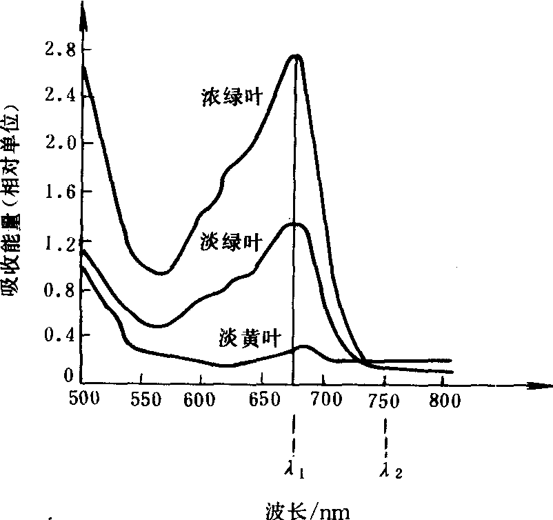叶子吸收光谱图 此叶片在光谱吸收特征曲线中波长680和750纳米处的光波吸收差值来表示。通过对比差值的测量,就可以测定一定叶面积内叶绿素的总含量。可用下式表示: