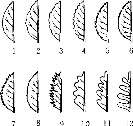 叶缘与叶片分裂的形态 1.全缘 2.波状 3.圆齿 4.牙齿 5.锯齿 6.细锯齿 7.重锯齿 8.具缘毛 9.缺刻 10.浅裂 11.深裂 12.全裂 |