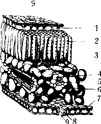 叶片立体结构 1.上表皮 2. 栅栏组织 3. 海绵组织 4. 木质部 5. 韧皮部 6. 维管束鞘 7. 下表皮 8. 保卫细胞 9.气孔 叶肉 叶肉yerou植物叶片内的同化组织。由含叶绿体的活细胞所组成,为叶内进行光合作用的主要部分。叶肉细胞之间有间隙,构成通气系统,通过表皮上的气孔,叶肉细胞得以外界进行气体交换。叶肉通常分为栅栏组织和海绵组织。前者细胞呈圆柱形,含较多的叶绿体,排列呈栅栏状。后者细胞呈不规则状,叶绿体较少,细胞组合不整齐,细胞间隙大。具有上述两种组织配置形式的叶,叫做背腹叶。若两种组织没有明显分化,或栅栏组织在叶的两面都有,中间夹着少量海绵组织,这种称为等面叶。两种组织间的区别程度及其数量比例,因植物种类和环境条件而异。阳生植物叶片内的栅栏组织较发达,与海绵组织区别亦明显;阴生植物的叶和沉水植物的叶,则海绵组织发达或两种组织分化不明显。 ☚ 叶镶嵌 托叶 ☛ 叶肉叶片上下表皮之间的基本组织。含叶绿体,是进行光合作用的主要场所。根据形态和排列,通常有栅栏组织和海绵组织之分。前者近上表皮(叶之腹面),细胞呈圆柱形;后者近下表皮(背面),呈不规则形,间隙甚大,为气体交换的重要通道。 |