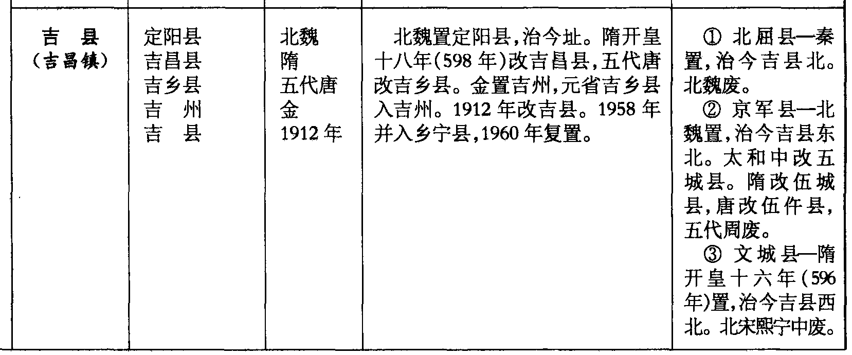 吉县(吉昌镇)定阳县吉昌县吉乡县吉州吉县北魏隋五代唐金1912年北魏置定阳县,治今址。隋开皇十八年(598年)改吉昌县,五代唐改吉乡县。金置吉州,元省吉乡县入吉州。1912年改吉县。1958年并入乡宁县,1960年复置。❶ 北屈县—秦置,治今吉县北。北魏废。❷ 京军县—北魏置,治今吉县东北。太和中改五城县。隋改伍城县,唐改伍仵县,五代周废。❸ 文城县—隋开皇十六年(596年)置,治今吉县西北。北宋熙宁中废。