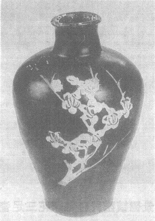 宋。高18.8厘米,口径4.8厘米。江西省宜春市文物管理委员会藏。瓶卷唇,短颈,丰肩,腹下部内收。器身施一层黑釉,瓶体上刻二枝盛开的折枝梅,以赭色彩料点画花蕊。作品构图简洁疏朗,极富迎风傲雪的气韵。剔花瓷器是吉州窑的特色产品,它与磁州窑的剔花工艺不同。它的瓷胎上不施化妆土,剔花后显露出的是胎体的黄白色,使釉色和胎色两相对比更为柔和,别具一格。吉州窑见“吉州窑荷叶纹瓷瓶”条目。