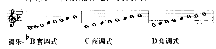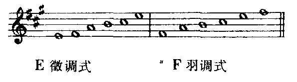 音列中的任何一个音级都可以做宫音,从而建立一个宫系统,因而产生了许多音高位置不同的宫系统和调式。如果按照调的五度循环从C宫系统开始向上依次排列,可建立G宫系统、D宫系统、A宫系统、E宫系统、B宫系统、#F宫系统、#C宫系统;再从C宫系统开始向下依次排列,可建立F宫系统、bB宫系统、bE宫系统、bA宫系统、(bD宫系统、bG宫系统、bC宫系统。如果去掉这三个音宫系统(bD、#G与#F、bC与B)即成为12个宫系统。在同宫系统中,宫调式的调号和同名的大调调号一样,而其他调式和宫调式的调号一样。 例❶:A宫系统(五声)各调式: