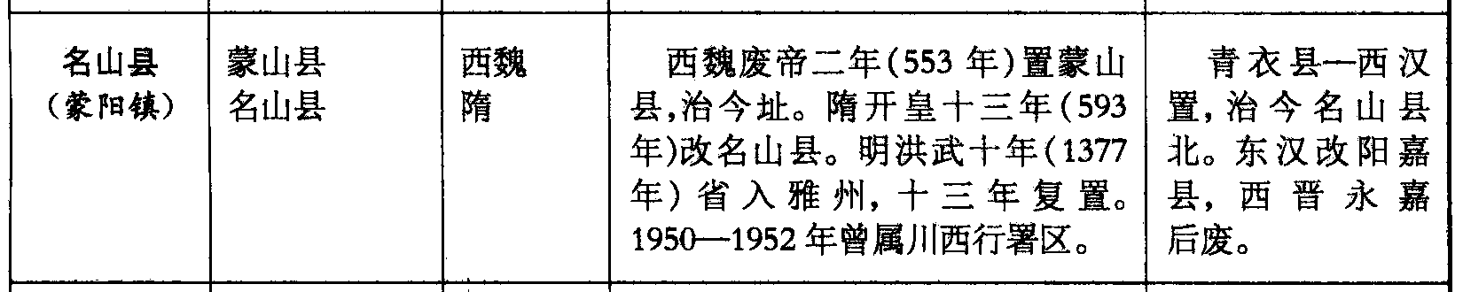 名山县(蒙阳镇)蒙山县名山县西魏隋西魏废帝二年(553年)置蒙山县,治今址。隋开皇十三年(593年)改名山县。明洪武十年(1377年)省入雅州,十三年复置。1950—1952年曾属川西行署区。青衣县—西汉置,治今名山县北。东汉改阳嘉县,西晋永嘉后废。