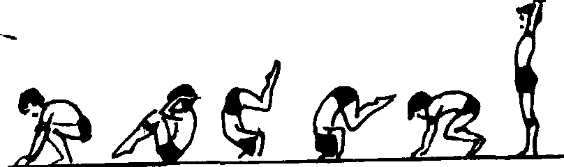 | 释义 | 后滚翻 后滚翻滚翻基本动作。俗称“倒毛”。又叫“倒跟头”。是向后的滚翻动作。做法是:团身向后滚动,两手掌心向上放于肩上,滚至肩、颈着地时团身翻臀,两手在脑后着地用力推直成蹲撑。 ☚ 前手翻 直腿后滚翻 ☛ 后滚翻 后滚翻双杠低难度动作之一。1989年出版的体育学院普修通用教材《体操》,将该动作选入。1958年出版的《男子竞技体操等级运动员规定动作图解》中,将该动作选入初学者双杠练习(二)、三级运动员双杠练习(二)、二级运动员双杠练习(一)和一级运动员双杠规定动作之中。该动作由身体高于杠面的挂臂后摆开始,当身体前摆过杠下垂直部位后,用力向前上方兜腿,稍屈髋,臀部接近杠上垂直部位时,向上伸腿展髋,抬头,两臂侧伸压杠挺身后翻,随即两手前伸握杠成挂臂前摆。初学时,两杠上可放置垫子,挺身后滚翻俯卧于垫子上。练习时保护者立于杠外,一手托臀,另一手托肩帮助完成后滚翻。当由肩倒立部位下落前摆时,保护者一手托其胸,另一手托腿帮助换握。 ☚ 倒立大摆落下经悬垂前摆上后分切成支撑 后滚翻成手倒立 ☛ 后滚翻 后滚翻平衡木项目的一个低难度动作。后滚翻和前滚翻一样是50年代移植到平衡木上的,在1957年中国一级运动员等级大纲和1958年健将级规定动作比赛大纲中,有简单的后滚翻动作,而50年代中国第一批(16名)运动健将的自选动作中,各种滚翻是当时自选动作中的主要难度动作,每套均不少于两个。因此,滚翻类动作在50年代在促进平衡木发展和丰富平衡木编排方面起到一定的作用。60年代虽然手翻类动作开始移植到平衡木上,但滚翻动作仍占有一定的优势,到了80年代,它仍为平衡木的基础动作之一。后滚翻一般由臀部开始,依次经背、肩、头支撑平衡木完成的向后翻滚动作。由于开始和结束姿势的不同,可以变化成各种难度的后滚翻,适合不同水平的练习者进行练习,如后滚翻成跪、成蹲、成倒立;经肩、经头的后滚翻以及慢滚、快滚等做法。 ☚ 手倒立前滚翻 单肩后滚翻成跪撑平衡 ☛ 后滚翻 后滚翻在垫上做围绕身体横轴、经头的向后团身翻转1周的动作。动作要领:蹲撑,两手推地,使身体迅速后移,两脚向前下方蹬地,接着低头团身向后滚动,同时屈臂、夹肘,两手放在肩上(手指向后),以臀、腰、背依次着地。当后滚至肩和头部着地时,臀部上翻,两手撑地臂伸直,翻转至两脚落地,抬头成蹲撑。保护与帮助:保护者站在练习者侧后面,当其肩背着地时,两手扶其腰向上提拉,助其推手翻转成蹲立。教学重点:由高处向低处做团身后滚翻。