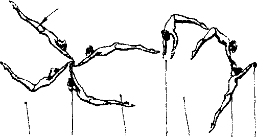 高低杠高难度动作之一。是从单杠动作移植而来,它又叫“猫跳”。动作要领:当面向内的向前大回环过低杠后身体要充分下沉,随之压臂后摆做强有力的振浪(鞭打)动作,当振浪到顶点时制动腿放手,使身体向上腾起,腾起时提臀屈体,使身体成直角姿势,同时转体180°越杠再换握成高杠悬垂。这个动作只有正确地做好振浪(鞭打)和制动腿动作,才能使之高高腾起。放手时两手要同时进行,换握时也基本上要一致。训练时先学会向前大回环直体腾越下,再在倒立架上做过杠的模拟动作,运动员俯撑在倒立架上,教练员提其腰部,运动员提臀屈体推手蹬地后转体180°越杠后成俯撑。用大回环连接时,最好用滑车保护带保护或在海绵坑上进行。