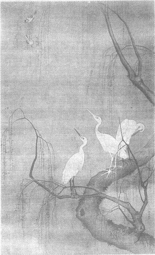 | 释义 | 吕纪三思图轴 吕纪三思图轴明。吕纪(见《吕纪桂菊山禽图轴》条目)绘。绢本设色。纵219厘米,横107厘米。山东省博物馆藏。此图绘春夜栖息在柳树上的三只鹭鸶。三思即三只鹭鸶的偕音。柳干粗劲虬转,旁枝疏落挺健,柔细纤长的柳丝在无风的夜色中悄无声息地垂挂着,逸秀舒展,像宽松的纱帘。新芽初绽,幼润鲜嫩,仿佛串串晶莹、细碎的水珠。万赖俱寂,可偏偏有一对玲珑小巧的翠鸟不肯安歇,它们在柳丝间追逐嬉闹,清亮的鸟鸣在这宁静的春夜中传得很远,很远。三只鹭鸶立在树干上休息,有的低头理羽,有的沉沉欲眠。虽然翠鸟的鸣闹使它们无法入睡,但一天劳碌之后,谁也不愿飞起来驱赶它们,只好仰头望着,耐心等待翠鸟自己飞走。鹭鸶羽色雪白,在月色中煜煜生辉,周围昏晦的景物更将它们衬托得分外醒目。此图景致幽旷空灵,造型典丽雅秀,笔法审细,色泽润淡。背景以水墨烘染,柳树的行笔圆润,鸟雀形象生动,白鹭羽毛以淡墨勾晕,敷以白粉,明暗变幻,颇有质感。诗堂有受亭氏题诗。
