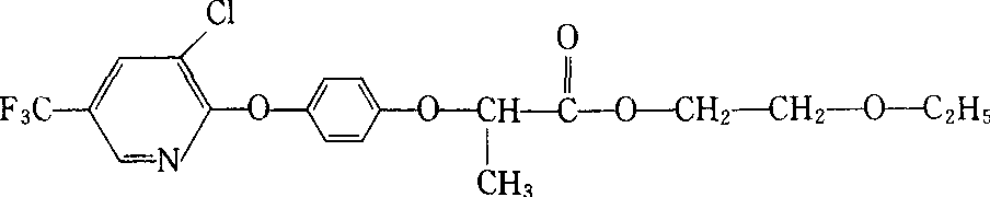 性能 原药(有效成分>99%)为白色晶体。熔点55~57℃ 。25℃时蒸气压为133.3×10-8帕。水中溶解度为9.3毫克/升。对高等动物低毒。原药大鼠急性经口LD50为518毫克/千克,兔急性经皮LD50>5000毫克/千克。对眼睛有中等刺激作用,对皮肤无刺激性。在试验剂量内对动物无致畸、致突变、致癌作用。对鱼类有毒。虹鳟鱼、蓝鳃翻车鱼的48小时LC50分别为5.72和3.07毫克/升。对鸟类和蜜蜂低毒。具内吸传导性,茎叶吸收后很快输导到整个植株。通过抑制根茎的分生组织使杂草死亡。落入土壤中的药物易被根吸收而起杀伤作用。对苗后至抽穗初期的一年生和多年生禾本科杂草有很好的防治效果。对阔叶和莎草科植物无效。在土壤中降解快,对作物无不良影响。 应用 盖草能广泛用于大豆、花生、棉花、油菜、亚麻、马铃薯、向日葵、西瓜、甘薯等多种阔叶作物和果园、苗圃地,防治看麦娘、牛筋草、马唐、稗、狗尾草、千金子、狗芽根、白茅等杂草。大豆和花生田在杂草3~5叶期(大豆和花生2~4片复叶)时,每公顷用12.5%盖草能750~1005毫升,对水30升茎叶喷雾。棉田杂草3~6叶期用盖草能商品量600~960毫升/公顷进行喷雾。长江流域油菜田多数地块以看麦娘为主,12.5%盖草能乳油450~750毫升/公顷即有较好的防治效果。盖草能适用于针叶和阔叶树苗圃,如松、杉、柏、杨、海棠等苗圃防除一年生禾本科杂草,商品量为750~1200毫升/公顷。多年生杂草剂量则需1950~2400毫升/公顷。 吡氟乙草灵haloxyfop又称盖草能、氯氟草除。苯氧基类内吸选择性茎、叶处理除草剂。化学名称:甲基2-[4-(3-氯-5-(三氟甲基)2-吡啶啶苯氧基]丙酸乙氧乙基酯。化学结构式如下。