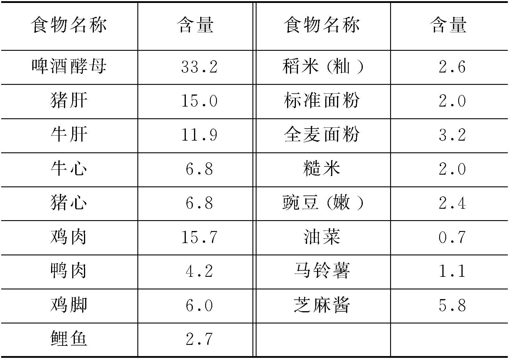 尼克酸又称烟酸。成年人每日需12~15 mg。含尼克酸较丰富食物见下表(以100g计,单位:mg):