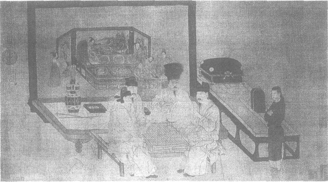 长卷,绢本,设色。此卷描绘的是南唐中主李璟及其兄弟会棋的情景。李璟(处于画面)正中坐在榻上细观两个弟弟摆棋布阵。对弈的两人中,右侧的是景达,神态自若,正举起手来与对方说着什么; 对面的景易则右手执子,举棋不定。大弟景遂则坐在中主身旁,凝视棋盘,目光专注; 手搭在小弟肩上,显出亲昵融洽的样子。每一个人都神态各异、富有个性。室内陈设简洁舒适,虽是描绘帝王生活,却只有侍从一人,突出了会棋的优雅与闲适。人物身后的屏风画的是白居易《偶眠》的诗意。诗中云:“放杯书案上,枕臂火炉前,老爱寻思事,慵便取次眠。妻教卸乌帽,婢与展青毡,便是屏风样,何劳画古贤。”屏风中又画 一三折屏风,上绘山水。此卷构图奇巧,以“重屏”开拓了画面意境,增添了画面情趣。它既反映了五代南唐的宫廷生活,也是中主李璟及其兄弟的肖像画,具有历史及艺术两方面的价值。周文矩人物画使用顿挫有致、抖曲颤动的线条来描绘衣纹,被史书称为 “战笔”或 “颤笔”,增添了花纹的质感和画面的古拙之气。