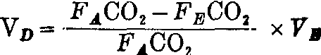 无效腔可应用开路通气测验装置测定。呼吸空气而以CO2为分析对象,代入(5)式计算,由于空气CO2含量接近0(0.04%),故(5)式可简化为: