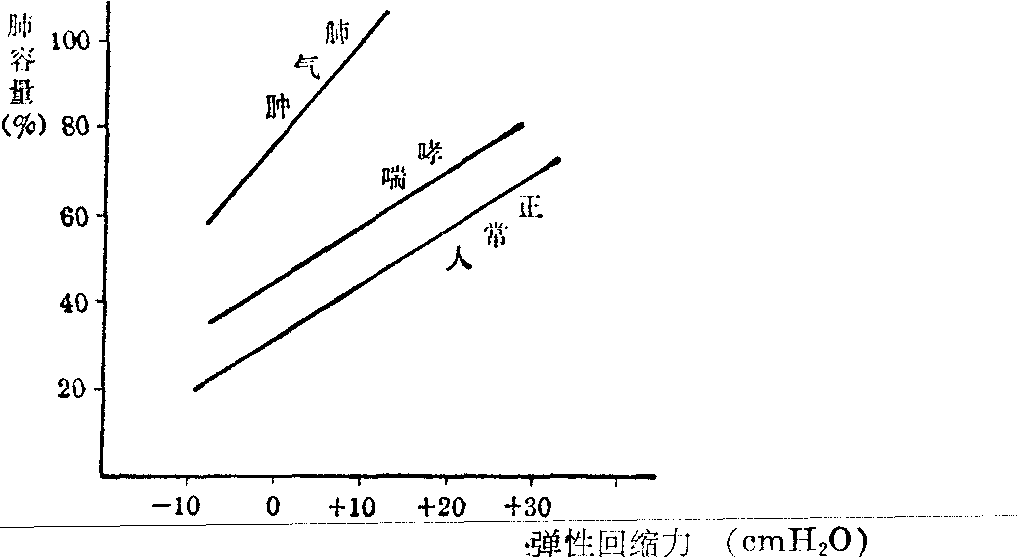 呼吸功(W) 是表达呼吸运动过程中为克服呼吸器官弹性和气道阻力所消耗的能量。肺呼吸功可用函数记录仪描绘一次呼吸周期的潮气量与相应食管压力变化的相关曲线,再以图解法计算一次呼吸功。一次呼吸功乘每分钟呼吸频率即得一分钟呼吸功。如在呼吸肌完全松弛条件下进行机械呼吸,在函数记录仪上描绘一次呼吸的口腔压力与相应潮气量变化的相关曲线,亦可按上述图解法计算胸廓和肺脏的总呼吸功。 呼吸动力机制的生理和临床意义: ❶肺顺应性和肺弹性回缩力皆为表示肺组织弹性的指标,但含义不同。回缩力是改变肺容量所需的压力;顺应性是不同肺容量肺回缩力的连线。回缩力大于正常,提示肺组织变硬,可能是肺充血、水肿或肺纤维化等的后果;回缩力减退则见于肺气肿,表示组织松弛。但是回缩力并不能说明肺组织的静态弹性特点,因为,肺容量不同,弹性回缩力可能一样(不同斜率肺顺应性相交于一点);相同顺应性肺组织在某肺容量时的回缩力可能不同 (相同斜率平行肺顺应性的位置不同)。可见表示肺组织静态弹性的最明确指标是肺顺应性线的斜率和位置。肺气肿患者肺顺应性线的斜率增加,位置左移,说明肺组织顺应性减低,不同肺容量时的肺弹性回缩力低于正常。哮喘患者的斜率与正常无异,但位置左移,说明肺组织顺应性正常,但不同肺容量时的肺弹性回缩力稍低于正常(见图1)。