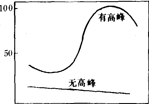 时间 图1 跃变型和非跃变型 在稳定温度下,呼吸跃变的进程可划分为如下阶段: 呼吸上升前, 呼吸速率最低的时期称为跃变前期; 呼吸速率上升时为跃变期或呼吸上升期, 达到最大值时为高峰期; 最后呼吸下降为跃变后期(图2)。 不同种类果实呼吸跃变进程持续的时间长短, 以及达到的最大峰值虽很不相同,但在呼吸上升的同时,与成熟作用有关的生理生化变化积极活跃, 合成反应旺盛进行,有新的核酸、蛋白质(酶)形成。呼吸高峰以后, 分解反应逐渐占主导, 组织结构逐渐解体、崩溃, 最后死亡。