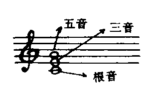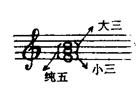 > 从根音到三音为大三度,从三音到五音为小三度,从根音到五音为纯五度的三和弦,叫做“大三和弦”。 从根音到三音为小三度,从三音到五音为大三度,从根音到五音为纯五度的三和弦叫做“小三和弦”。 从根音到三音和从三音到五音都是大三度,从根音到五音为增五度的三和弦叫做“增三和弦”。 从根音到三音和从三音到五音都是小三度,从根音到五音为减五度的三和弦叫做“减三和弦”。 按照三度音程关系叠置起来的四个音构成的和弦,由于从根音到第四音是七度音程,所以叫做“七和弦”。七和弦中四个音的名称见下图: