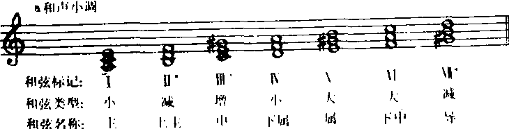 和弦的标记是根据根音在大、小调中的音级级数用罗马数字来表示的。大和弦用大写罗马数字表示,小和弦用小写罗马数字表示,增和弦在大写罗马数字后的右上角加“+”,减和弦在小写罗马数字后的右上角加“σ”。在大、小调各音级上构成的和弦其名称分别为主、上主、中、下属、属、下中、导和弦。如: