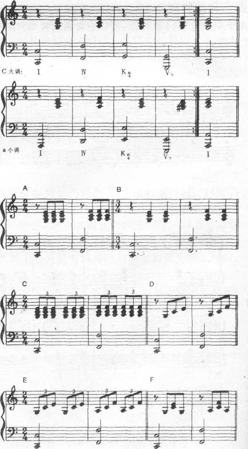 | 释义 | 和弦基本弹奏练习 和弦基本弹奏练习Hexian jiben tanzou lianxi用双手弹奏以下和弦连接,并在C、F、G、a、d、e调上练习:节奏型变化:用以上大、小调和弦连接骨架,进行以下各种节奏型变化弹奏: