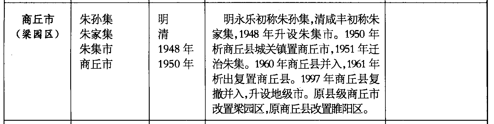 商丘市(梁园区)朱孙集朱家集朱集市商丘市明清1948年1950年明永乐初称朱孙集,清咸丰初称朱家集,1948年升设朱集市。1950年析商丘县城关镇置商丘市,1951年迁治朱集。1960年商丘县并入,1961年析出复置商丘县。1997年商丘县复撤并入,升设地级市。原县级商丘市改置梁园区,原商丘县改置睢阳区。