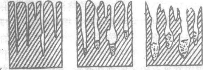 喀斯特地貌可分为地表和地下两种基本类型。常见的地表喀斯特地貌有:溶沟、石芽、石林、落水洞、漏斗、溶蚀洼地、喀斯特盆地、干谷、盲谷、峰丛、峰林和孤峰等不同形态。在温暖湿润的气候条件下,地表水沿着石灰岩地面流动,顺着节理、裂隙进行溶蚀,形成宽浅不一的溶蚀沟槽,称为溶沟(图1)。溶沟一般宽可从十几厘米到几米,深可达1米以上,长度不等,溶沟之间突起的脊、柱称为石芽(图1)。石芽的高度不等,可从数十厘米到数米。石芽除露出地面的,还有埋在地下的,是由地下水在下渗过程中溶蚀而成。发育在厚层石灰岩中的高大石芽,其间有平行的垂直溶沟、沟深坡陡,形似森林,故名石林,如我国云南的路南石林。地表水沿着岩层裂隙垂直向下溶蚀,并有塌陷发生,成为地表水流向地下河或地下溶洞的垂直通道,称之为落水洞。按其形态特征可分为裂隙状落水洞、竖井状落水洞和漏斗状落水洞等。一般落水洞的洞口直径为7—10米左右,深度为10—30米左右,最深可达百米以上。在被溶蚀的石灰岩地表常可见到一种平面轮廓为圆形、椭圆形,直径数十米,深数米至十几米的漏斗状凹地,称为漏斗(图2)。漏斗下部常有管道通往地下,地表水沿此管道下流,如通道被粘土碎石堵塞,常积水成池。按其成因可分为溶蚀漏斗、沉陷漏斗和塌陷漏斗。漏斗是喀斯特发育初期的产物,它是喀斯特地下水垂直循环作用的结果,所以漏斗多分布在喀斯特地貌高原面上。例如宜昌的山地平面上,漏斗很发育,落水洞和溶蚀洼等负地形也很多,平均每平方公里达30多个。漏斗再进一步溶蚀扩大就成为溶蚀洼地(图3、4)。溶蚀洼地底部如果被红土和其它风化物覆盖,其底部的漏斗、落水洞等流水通道被堵,积水成为喀斯特湖。溶蚀洼地底部平坦,其直径超过百米,甚至可达1—2公里。溶蚀洼地进一步扩展形成宽坦的盆地,宽度可达数百米至数公里,长度达几十公里,称为喀斯特盆地。南斯拉夫学者J.司威治最早称这种地形为坡立谷(polje),原意为可耕种的平地,现已成国际通用术语。盆地的边坡陡峭,底部平坦,常被残留的棕黄色粘土、红色粘土及河流冲积物所覆盖。一些溶蚀残丘、孤峰、峰林常常耸立在盆地边缘或排列在河谷两侧,著名的桂林山水就是这种奇特的喀斯特景观(图4)。在石灰岩地区,河流常沿裂隙、孔洞下渗,使河床无水而成为干谷。有时河流从某一陡坎的洞中涌出,从地下流出地面,然后流一段之后又从落水洞流入地下,这种上下游封闭的河谷称为盲谷,河流转入地下称为伏流,如贵阳市西南红水河支流涟水,在地表时隐时现,出现多次伏流。在喀斯特盆地的边缘广泛发育着峰林地貌,主要由峰丛,峰林、孤峰和溶丘组成,它们多发育在岩性较纯、厚度较大并多节理、断层的地区。峰丛主要发育在碳酸岩山地或高原边缘地区,其特点是基座相连,山峰陡峭,是峰林地貌发育的早期阶段。当喀斯特地貌进一步发展,则形成基座分离的陡峭山峰,远望如林,称为峰林,我国广西的桂林、阳朔等地为典型代表。喀斯特发育的晚期阶段,是多数峰林已被溶成残丘平地,只有少数较高山峰零星孤立地耸立在平原之中,称为孤峰,相对高度可达50—100米,如桂林的独秀峰、伏波岩等。在石灰岩地区,地表以下的喀斯特地貌形态十分复杂,主要包括溶洞和地下河。地下水沿着可溶性岩层层面、节理和断层裂隙等进行溶蚀形成的地下洞室叫做溶洞。地下水在岩层中顺着细窄的缝隙流动缓慢,溶蚀很慢,随着裂隙扩大,地下水循环流动加速,不仅溶蚀作用加强,而且机械侵蚀作用也随之加强,并产生重力崩塌等作用,使溶洞迅速加大。溶洞规模大小差别悬殊,形态各异。根据洞穴的剖面形态可分为:水平状、管道状、阶梯状、袋状、多层状和大厅状等(图5)。这些形态各异的溶洞的形成是与地下水的动态和地质构造有关的。例如,在垂直循环带中发育的溶洞多呈垂直的,规模较小,以管道状、袋状等形态为主,如北京周口店猿人洞。在地下水的水平循环带中,溶洞内经常充满水,形成地下河、地下湖和地下瀑布等,溶洞多沿水平方向发展,在断裂破碎带或节理交错带上常发育成厅堂状,如桂林的七星岩为廊道式溶洞。受岩层产状和地质构造影响,溶洞可能呈现倾斜状。如果地壳间歇性抬升,或地下水呈阶段性下降,则可能出现多层状、阶梯状溶洞,如北京房山的石花洞、广西上林三里肖发洞等。在喀斯特地下侵蚀基准面以下还发现有深部溶洞。目前世界上发现的最深溶洞是墨西哥城西南200多公里处的华乌特拉岩洞,深1 600多米,洞壁为大理岩,洞底为地下河。我国已知最大深部溶洞是湖南某矿区地面以下186—430米。在溶洞发育过程中不断地进行化学、生物的沉积和物理风化碎屑物的堆积以及崩塌堆积等过程。