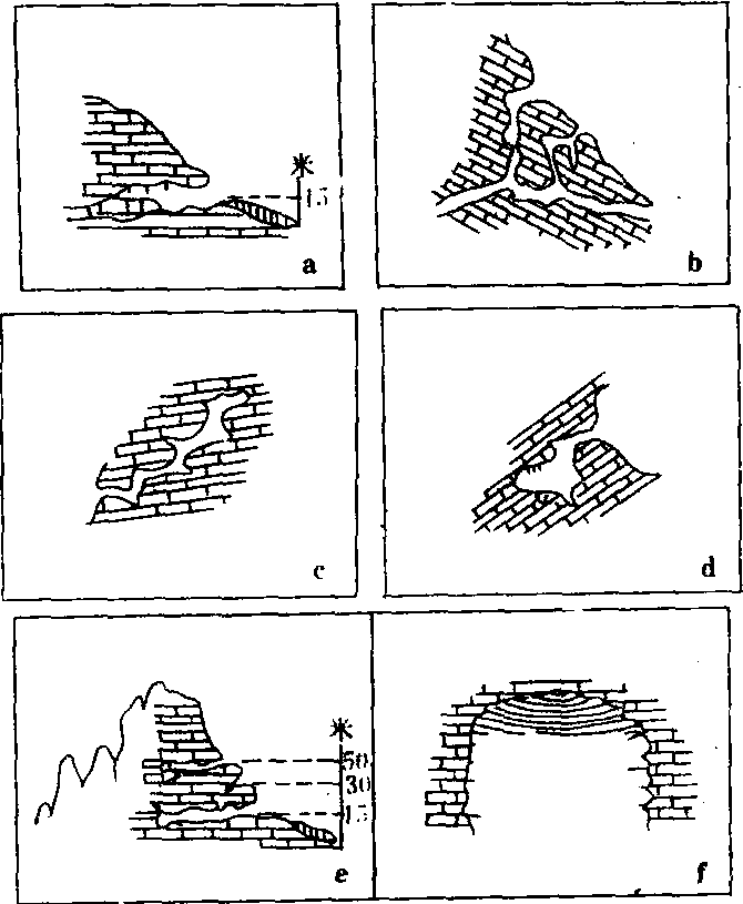 a.水平状溶洞; b. 管道状溶洞;c.阶梯状溶洞d.袋状溶洞;e.多层状溶洞;f.大厅状溶洞
