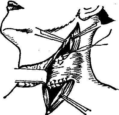❷将粘膜的切缘和翻入的咽腔皮瓣断端缝合。然后缝合裂口两边之皮肤,以闭合之。