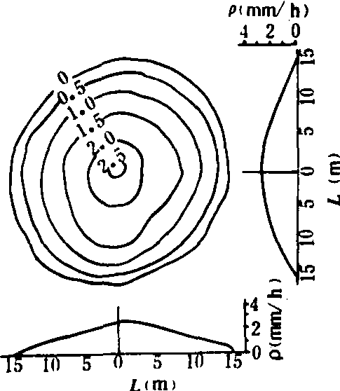 另见:洒水 引水 ☚ 引水 开辟 ☛ 喷灌sprinkling irrigation将具有压力的水通过喷头喷向空中,在空气阻力和重力作用下,裂散成雨滴状降落在田间及作物上的一种灌溉方式。 发展简史 喷灌技术始创于19世纪末,在美国和俄国首先使用了固定式的自压管道喷灌系统。1913~1920年间出现了简易的喷灌车,用于草地、菜园、苗圃、果园等。1922年苏联研制出自动旋转喷头和远射程喷灌装置。30年代制成了双悬臂式喷灌机并研制成塑料管道。40年代出现了摇臂式喷头和快速接头,并开始使用铝合金管。1935年美国发明了滚移式喷灌机。1937年苏联发明了自走平移式喷灌机。1952年美国发明了水力驱动型圆形喷灌机;60年代又研制成电力驱动型喷灌机。同时出现了聚乙烯半软管和钢索绞盘式喷灌机。70年代初研制成同步脉冲固定式喷灌机,70年代末美国生产了电力驱动全自动化平移式喷灌机,并发展耗能少的低压喷灌机。 全世界喷灌面积从1960年的3750万亩发展到1985年的3亿多亩。英、法、德、匈牙利等国喷灌面积已占全部灌溉面积的80~90%。美国1985年喷灌面积达1.35亿亩,苏联1980年已达1.53亿亩。中国于1953年在华北农业科学研究所试制成第一套短射程喷灌设备,随后北京农业机械厂等单位陆续试制成蜗轮蜗杆式中射程喷灌机和九龙一号远射程喷灌机。1954年在上海郊区建立了第一个蔬菜喷灌工程。1977年研制成PY1喷头系列和喷灌泵系列。并相继研制出大型、中型、小型和轻型喷灌机。1978年以后又研制成全射流喷头和中心支轴式(圆形)、平移式、绞盘式和滚移式喷灌机。同时低压喷头和微型喷头也相继出现。1985年喷灌面积达1 400万亩。 喷灌的特点 有:❶省水。根据土壤与作物的需水控制喷水量,防止土壤深层渗漏和地面径流,避免流失水土。一般比地面灌溉省水30~50%。在透水性强的沙质土可省水70%以上。 ❷增产。根据作物不同生长期的需要实行浅浇勤灌,严格控制土壤水分,保持土壤肥力,调节田间小气候,保证作物在最优条件下生长。 ❸省工省地。减少了地面灌溉所必须的毛渠、畦沟、田埂等地面工程,提高了土地利用率。一般可节约用地7~13%。 ❹适应性强。具有对不同作物、不同地形、不同土壤的适应性。 ❺局限性。受风的影响大,4级风以上由于飘移损失大不宜喷灌。蒸发损失可达10%。设备投资较高。 喷灌系统类型 喷灌系统由水源、动力机、水泵、管道及附件、喷头和控制机构组成。按照喷灌作业过程中机具移动的程度分为固定式、半固定式和移动式三类。 固定喷灌系统 动力机、水泵、管道和控制机构均固定安装,干管和支管多埋设在地下,喷头装在由支管接出的竖管上,可固定不动,亦可根据轮灌需要顺序拆装轮流使用。这种系统操作管理方便,效率高,占地少,便于综合利用(如结合施肥、喷农药等)和实现灌溉的自动控制。但投资大,设备利用率低,竖管妨碍机耕。适用于灌溉频繁的经济作物区,如蔬菜区和高产作物地区。 半固定喷灌系统 动力机、水泵和干管均固定安装,支管和喷头可沿干管移动作业,支管与设在干管上伸出地面的给水栓连接后作业。移动的方式有人力搬移式,人力滚移式,由拖拉机或绞车牵引的端拖式,由小发动机驱动作间歇移动的动力滚移式、绞盘式等。这种系统设备利用率较高,投资省,但移动拆装频繁,使用不便。常用于大田作物。 移动式喷灌系统 动力机、水泵、管道及附件、喷头及控制机构按一定方式组合成整体性机具,全部移动作业,因而可在一个灌溉季节里在不同地块轮流使用。根据动力机功率大小可分为轻、小、中、大型喷灌机具,根据移动方式可分为手抬式、手推式和自走式。轻小型喷灌机投资少,机动灵活,设备利用率高,但操作劳动强度大。是中国使用最广泛的机型。大中型喷灌机自动化程度高,灌溉面积大,运行成本低,但一次性投资大,维修保管不便,这种系统适用于灌溉次数较少的大田作物和小块地段。在有条件的地区,可发展自压喷灌。其好处是可以利用水的自然落差,不需动力机和水泵,设备简单,操作方便,使用成本低。 性能指标 评价喷灌系统的性能常用喷灌强度、喷灌均匀度和水滴打击强度三项指标。 喷灌强度 单位时间内喷灌面积的喷洒水深。通常用喷灌面积内各点喷灌强度的平均值,即平均喷灌强度表示。平均喷灌强度的大小要适应土壤透水性要求,喷洒时不能产生积水与地面径流。 喷灌均匀度 在喷灌面积内水量分布的均匀程度。它与喷头的结构,工作压力,喷头布置间距与组合形式以及地面坡度、风速、风向等有关。常用喷洒均匀度系数CDU表示:  式中: n为受水量雨筒总个数;hi为点喷灌水深(毫米);h为平均喷灌水深(毫米)。一般CDU值不应低于80%。 喷灌均匀度还可用喷水量分布图表示,即喷灌范围内喷灌强度等值线图和此图的平行与垂直风向的纵剖面图(图)。 水滴打击强度 单位受雨面积内水滴对土壤或作物的打击能量。它与水滴大小、降落速度以及水滴密度有关。实践中常用水滴大小间接表示打击强度。也可用喷头入口处工作水头 H(米)与喷嘴直径d(米)的比值即H/d间接表示。一般农作物要求H/d值达3 000~4 000,而蔬菜和娇嫩植物则要求H/d值为4 000~6 000。