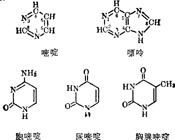 嘧啶碱都是嘧啶的衍生物,嘌呤碱都是嘌呤的衍生物。这两类物质的理化性质颇相似,一般多具有弱碱性,大多微溶于水,易溶于稀酸或稀碱中,不溶于一般有机溶剂;对紫外光都有较强的吸收作用,其最大吸收波长为250~280nm;分子中含氧基者可表现酮醇互变作用。细胞中自由存在的嘧啶碱或嘌呤碱甚少,而是作为核苷、核苷酸和核酸的组成成分存在。核酸分子中所含的嘧啶碱主要是尿嘧啶(U)、胞嘧啶(C)及胸腺嘧啶(T),所含的嘌呤碱主要是腺嘌呤(A)和鸟嘌呤(G)。其中胞嘧啶、腺嘌呤及鸟嘌呤是RNA及DNA组成中的共同碱基,但尿嘧啶则主要存在于RNA中,而胸腺嘧啶则主要存在于DNA中。