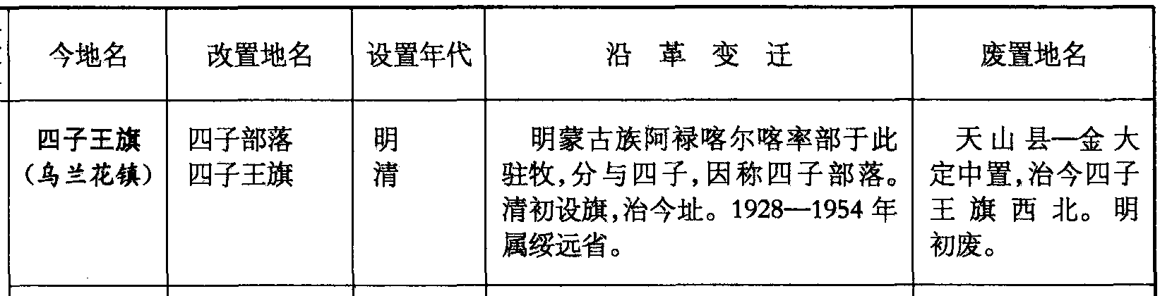 四子王旗(乌兰花镇)四子部落四子王旗明清明蒙古族阿禄喀尔喀率部于此驻牧,分与四子,因称四子部落。清初设旗,治今址。1928—1954年属绥远省。天山县—金大定中置,治今四子王旗西北。明初废。