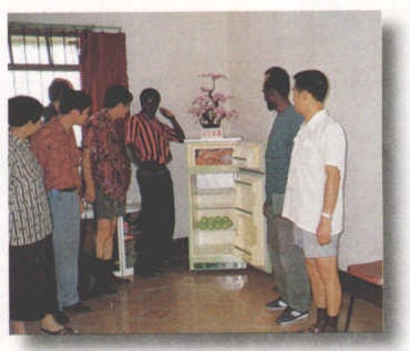 3沼气除用于农户点灯、 煮饭外, 沼气、沼液、 沼渣还被广泛用于生产中。 全省已开展沼液浸种、 喂猪、 养鱼、 育蚕、孵鸡、 治虫、 水果保鲜、 储粮等30多个沼气综合利用项目; 其中沼液浸种年播种面积达300万亩,增产粮食5315万千克,创经济效益6000万元。 沼气综合利用为广大农民致富奔小康开拓了新路。 图为外宾参观绵竹县农户家中的沼气冰箱。