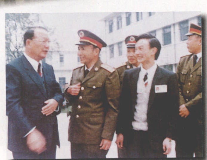 解放军总后勤部部长赵南起(左一)视察成都蜀阳制药厂。