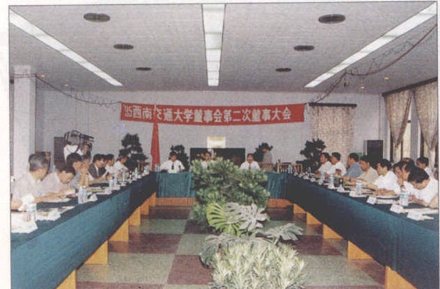 1 西南交通大学董事会自1994年7月成立以来, 已筹集资金1000多万元。 图为1995年7月召开的西南交通大学董事会第二次董事大会会场。