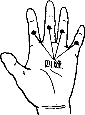 | 释义 | 四缝经外奇穴名。出《奇效良方》。位于手二、三、四、五指掌侧面,近端指骨关节横纹中点,左右计8穴。另说在二、三、四、五指掌侧面,远端指关节横纹中点(《针灸孔穴及其疗法便览》);或近端指关节横纹之两头处(《中国针灸学》)。主治疳积,百日咳,蛔虫症等。三棱针浅刺0.1~0.2寸,挤出黄白色黏液(图44)。