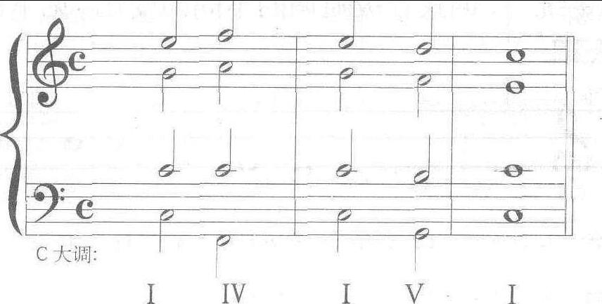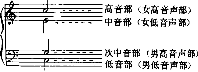 由四个独立的声部组合而成的和声形式。它是音乐作品中最常用的声部组合方式,尤其在混声合唱中运用得更多。四部和声既能保证和声音响的丰满,又不会造成和弦音过多的重复而不能使声部间得到平衡,所以,它是和声写作的重要基础,也是和声习作中所采用的基本方式。四个声部由高而低依次称为高音部、中音部、次中音部、低音部。各个声部具有不同的作用:在一般情况下,高音部是旋律声部,低音部是和声的基础,这两个声部都属于外声部;中音部与次中音部起充实和丰富和声效果的作用,属于内声部,它们与高音部一起又总称为上方声部。各声部的音域大致与混声合唱中的女高音、女低音、男高音及男低音相同。四部和声一般应用大谱表形式写作,为了使声部划分得醒目,可将每一个行谱表中两个声部的符干分别向上或向下。如: