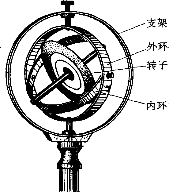 ❶常平架回转仪,见图1。包括一个边缘厚实的转子和内、外两个轻质框环。转子可绕自身对称轴转动,自转轴安装在内环上,内环的转轴安装在外环上,外环的转轴装在固定支架上。三根转轴的轴线互相垂直并相交于回转仪的中心。当转子作高速转动时,转子的角动量可以表示为J=Iω,其中I是转子相对自转轴的转动惯量,ω是转子的自转角速度。如果不考虑轴承的摩擦和空气阻力,由于重力作用在刚体的质心上,质心又和支点重合,因此重力对支点的力矩为零,使角动量Iω保持不变,ω是常矢量,即自转角速度不仅大小不变,而且方向也不变。利用这一原理,可以制作火箭、导弹、飞机等飞行器械的导航仪器,这些能对飞行物体指示航向和给出飞行物体转弯角度的仪器称作陀螺方向仪。回转仪的支座固定在飞机上,自转轴提供了给定的方向,也就是仪表的基准线。基准线沿铅直方向,可以用俯仰角表示飞机绕垂直飞行方向的水平轴偏转的姿态,用侧滚角表示飞机绕本身纵向轴线偏转的姿态。基准线沿水平方向,可用偏航角显示飞机绕铅直轴线在水平面内的转动姿态。通过仪表测出这几个角度并与其它精密仪器相配合,能够保证飞机沿着正确航线飞行并保持正确的飞行姿态。当高速回转仪的转子受到冲击性外力矩作用时,不会明显改变自转轴的方向,但是由于摩擦力矩及其他的干扰,自转轴的指向会发生漂移,因此需要在一段不长的时间间隔内作一次精密调整。