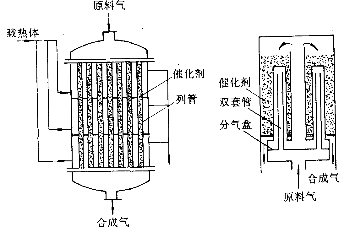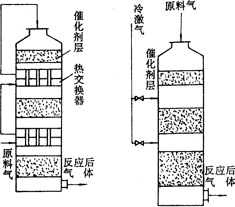 中间换热式绝热催化反应器是在两层催化剂之间进行热交换,催化剂床近乎绝热过程,因而床层温度随反应而改变。中间换热有间接换热和直接换热两种方式,前者可采用蛇管式、列管式等间接热交换器;后者可采用冷原料气直接掺入的方式进行直接热交换,这种方式又称为冷激式。